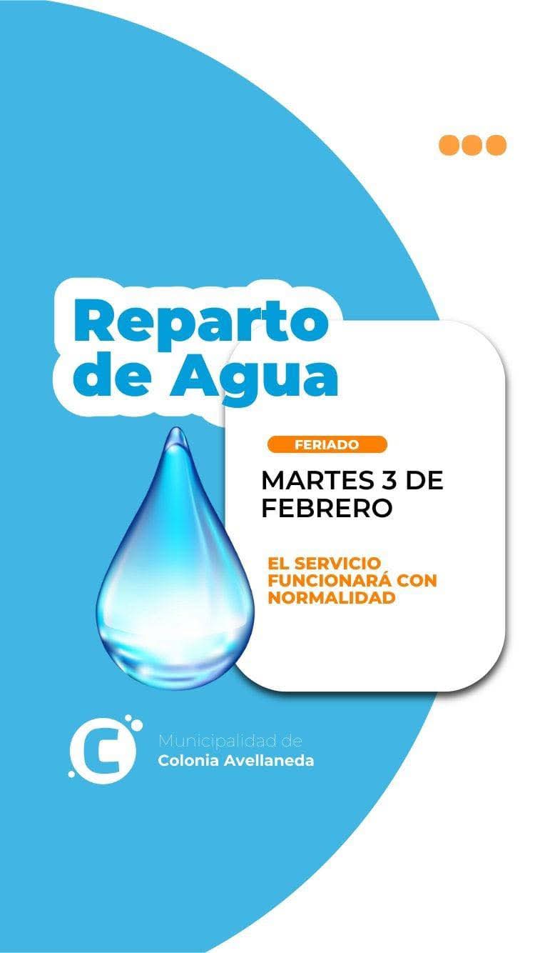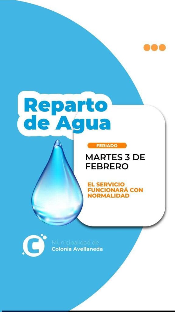 Desde el Municipio de Colonia Avellaneda se informa a los vecinos que el día martes 3 de Febrero el reparto de bidones de agua se desarrollará con normalidad.